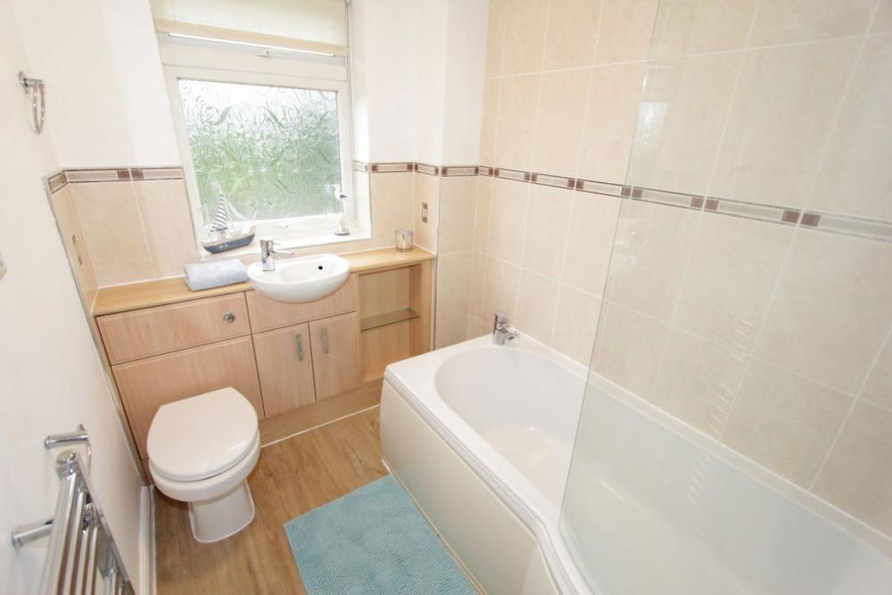 Bathroom - 7ft 6in x 5ft 6in (2.31m x 1.72m).Neutral décor, partially tiled walls & laminate flooring. White bathroom suite, P shaped bath with thermostatic shower. WC & wash hand basin fitted within a vanity unit. Heated towel rail. UPVC double glazed window to rear elevation.
