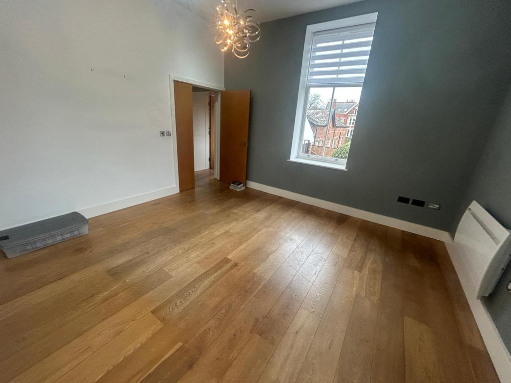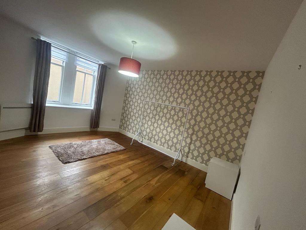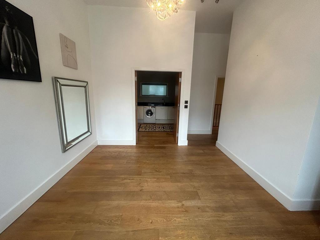 Extending over two floors (with entrance on the ground floor), this property welcomes with a spacious hallway and beautifully finished oak effect wood floors leading throughout the living areas and bedrooms. Step into the bright lounge and dining area with high ceilings, large sash windows and period charm complemented by tasteful modern lighting. The fully fitted kitchen is sleek in white and black, equipped to a high standard with integrated fridge/freezer, oven, microwave, ceramic hob, and washer/dryer for the ultimate ease.