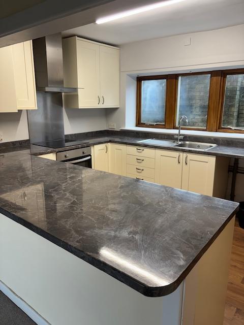 Open plan kitchen 14ft 4 x 11ft 4 - Electric oven and hob. Plumbing for auto washer. Space for medium fridge freezer. Units in cream with marble effect laminate