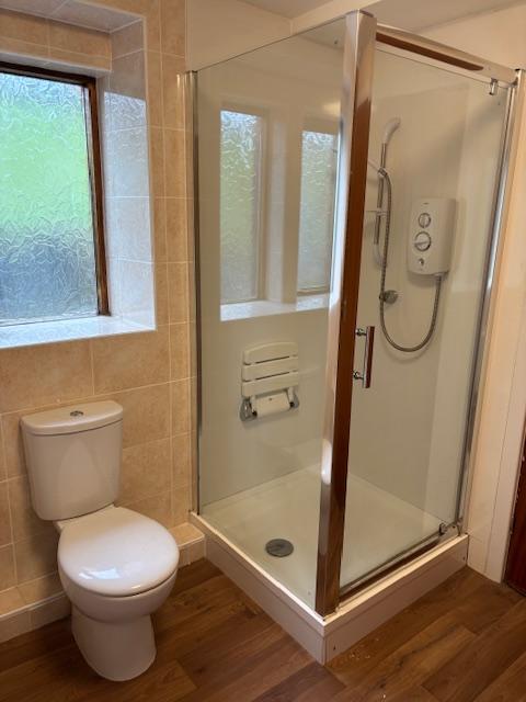 Bathroom - 8ft 6" x 8ft 1" - with fully fitted suite in white. Fitted storage cupboards, bath and walk in enclosed shower. Fully tiled