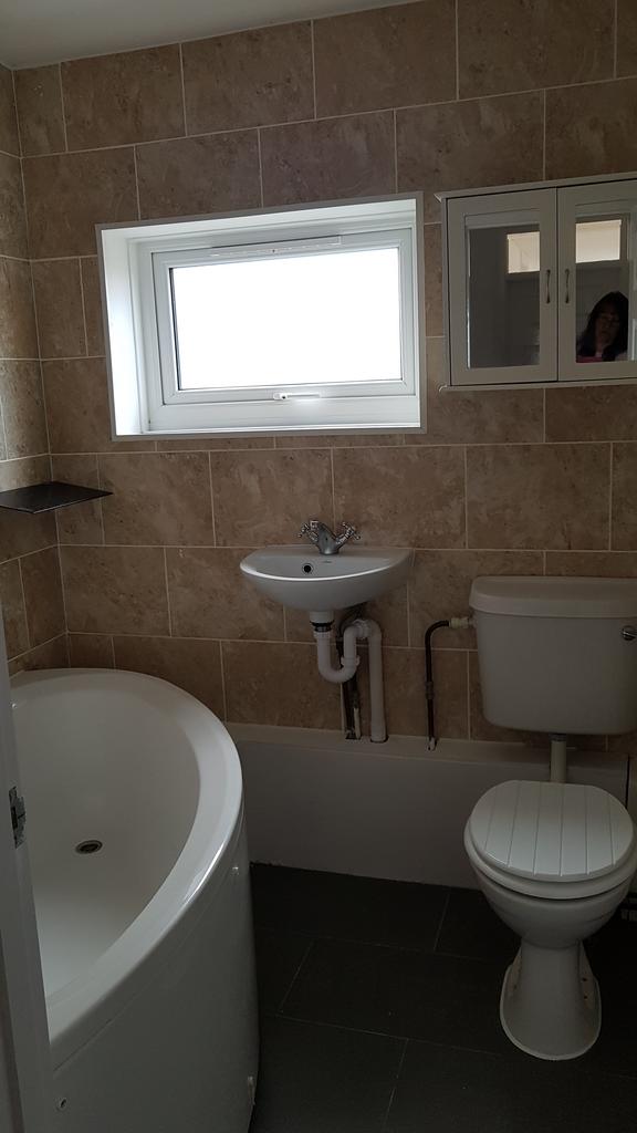 Window to front aspect, fully tiled walls, Three piece suite comprising of low level W.c., wash hand basin and corner bath with shower. Panel radiator. Tiles floor