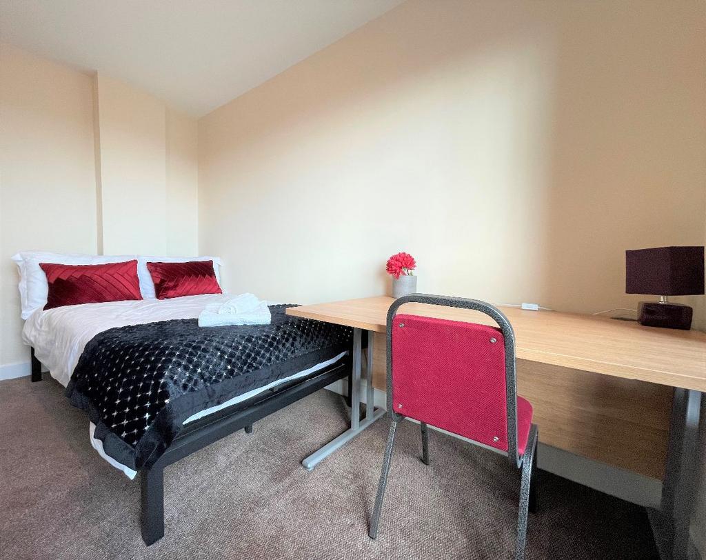 This large bedroom comes furnished with a 4ft Double, Double Wardrobe and Desk & Chair. The bedroom has TV connection and internet point. The bedroom has large floor to ceiling windows giving great views of the city.