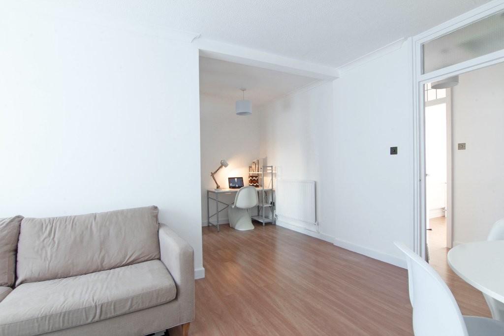 To the rear, a sunny private roof terrace provides the perfect spot for evening drinks or relaxed weekend lounging. The property also includes a well-appointed fitted kitchen, a spacious bathroom, excellent built-in storage, an entry phone system, and residents' parking. Offered fully furnished.