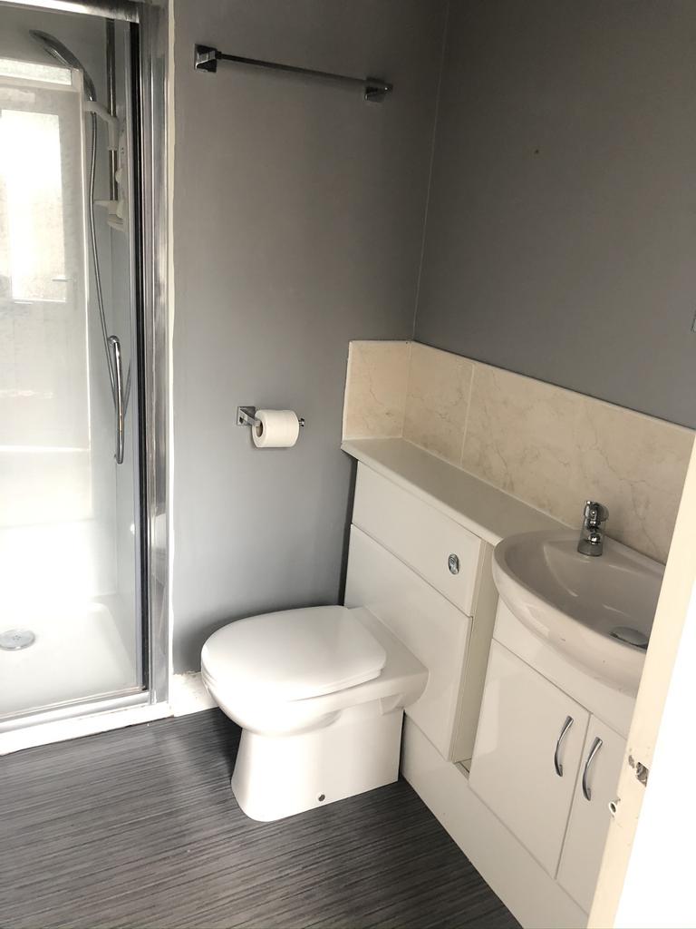 The spacious double bedroom features attractive wood-effect laminate flooring and plenty of room for furniture, creating a comfortable and restful retreat. Accessed just off the main hallway, the wet wall shower room is finished to a notable standard and fitted with a white modern suite and a generously sized, glass-door shower enclosure with electric shower.