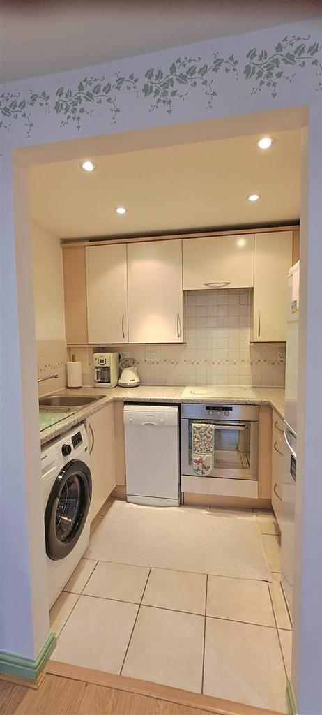 Floor and wall mounted units, roll top work surfaces, sink and drainer unit with mixer tap, built-in oven with hob and extractor fan, part tiled surround, tiled flooring, space for: washing machine, slim line dishwasher and fridge freezer.
