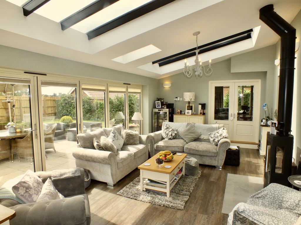 A beautifully presented 4/5 Bedroom detached modern family house with Double Garage and ample private parking. Hill House is situated in a lovely location on the edge of this attractive village. Well proportioned accommodation with 3/4 Reception Rooms including a fabulous Garden Room with wood burning stove and bi-fold doors to the large gardens.