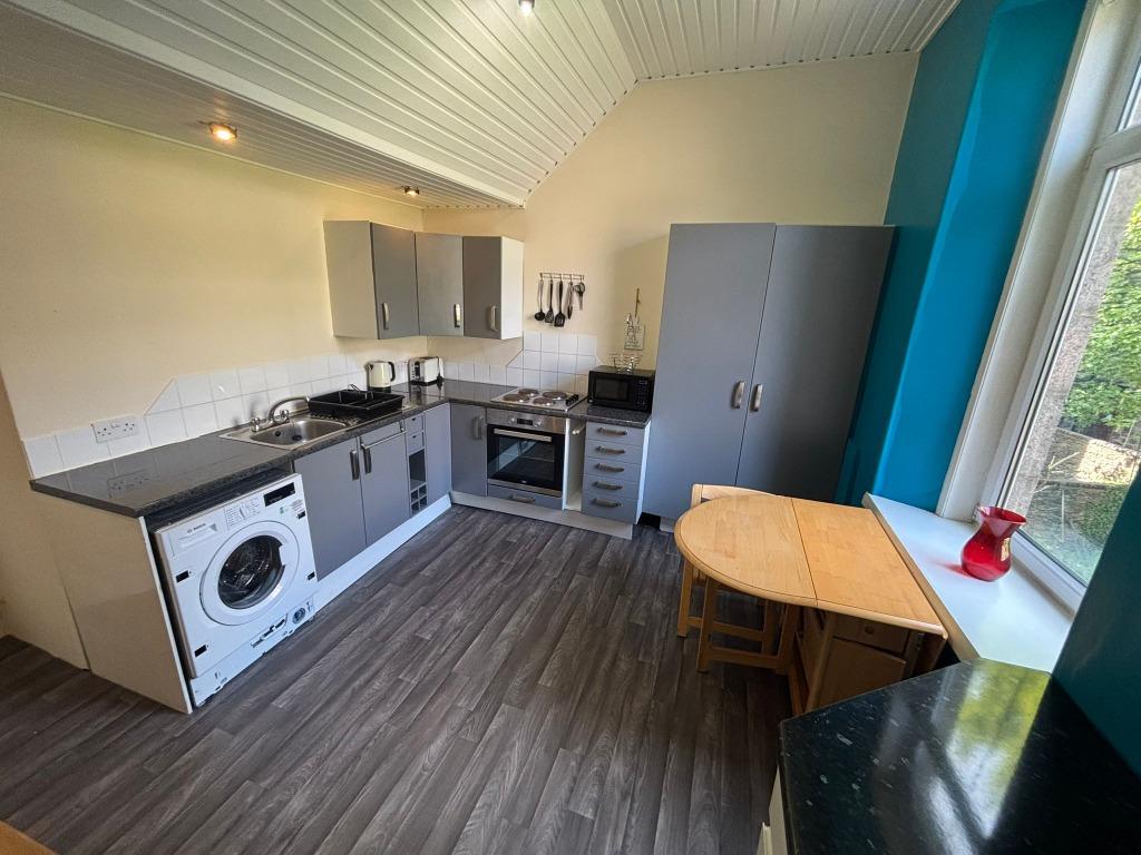 Beginning at the front of the property, the hall gives access to all rooms. The living room is a bright and comfortable space to do some relaxing in! The large windows let in lots of natural light and the room contains a flat screen TV, a leather sofa suite and a soft cream carpet. The kitchen/dining area has a wooden dining table, wooden flooring and a modern kitchen with granite countertops, grey/blue wall units and fitted with all the usual appliances including a fridge freezer, washer/dryer, electric hob and oven. There is a double bedroom with a fitted wardrobe and a flat-screen TV. The shower room is the real star of this show, with a large shower space and marble tiling which extends to the whole bathroom.