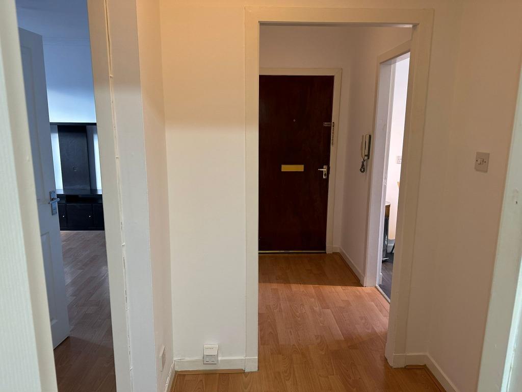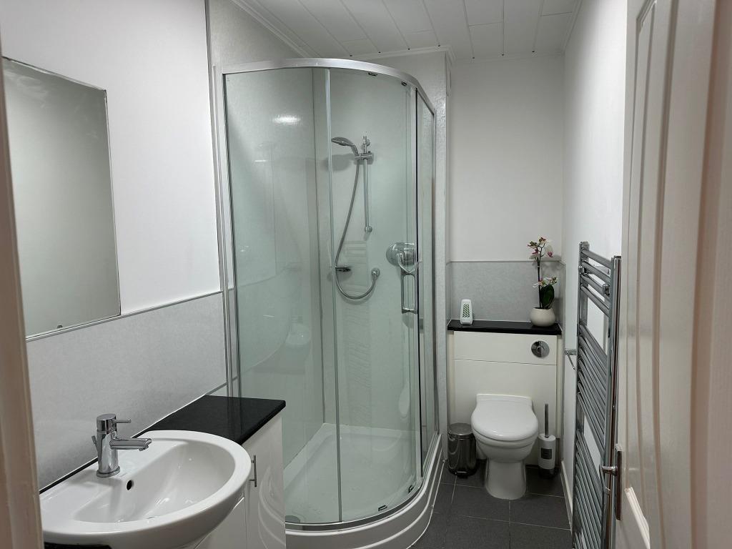 The hall gives access to all rooms. Beginning in the kitchen/dining area, there is a glass dining table, two chairs and a lovely cream kitchen, fitted with all the usual appliances including a fridge, freezer, electric hob, oven and microwave. There are two double bedrooms both with fitted wardrobes, and a shower room with a pod shower and a cupboard unit for storage. The bright lounge has lovely wooden flooring, a red sofa suite and a dark wood TV unit.