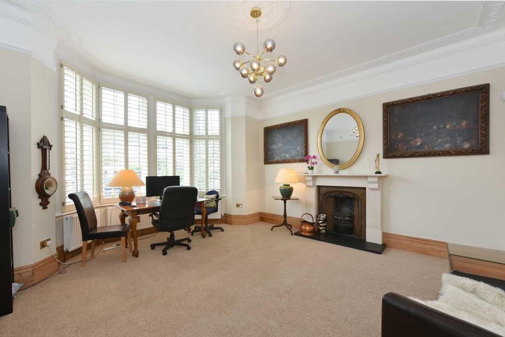 The welcoming entrance hallway flows to the ground floor accommodation. At the front of the house there is an elegant reception room with feature fireplace. A generous study with bespoke fitted cabinetry offers a peaceful outlook and is ideal for home working. To the back of the house is a spacious rear reception room which leads onto a dining room seating ten comfortably. The dining room benefits from oak picture window sliding doors across the entire width of the room, creating a fantastic view onto the beautiful mature rear garden. The well-equipped kitchen which has baltic brown granite work surfaces, a Siemens dishwasher, Neff gas hob and double under counter oven. A separate utility area which has a large stainless-steel utility sink, Miele washing machine and tumble dryer. There is excellent cloakroom storage and separate WC. A rare added benefit is a dry cellar which offers invaluable additional storage space. The house also benefits from double glazed windows throughout and plantation shutters in most rooms.
