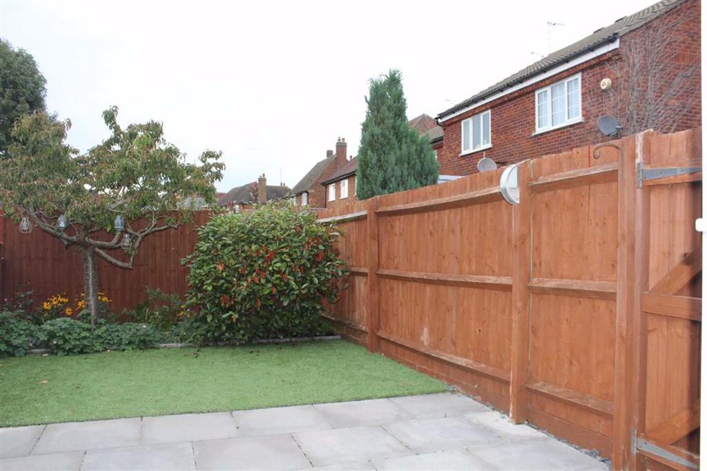 The private rear garden has a paved patio, artificial lawns, shrubs, fully fenced boundaries and a strong timber gate to the side.