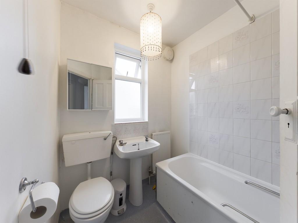 BATHROOM with window to side, panelled bath with three quarter tiled surround and Aqualisa shower over, wc, wash handbasin with tiled splashback, radiator, extractor fan.