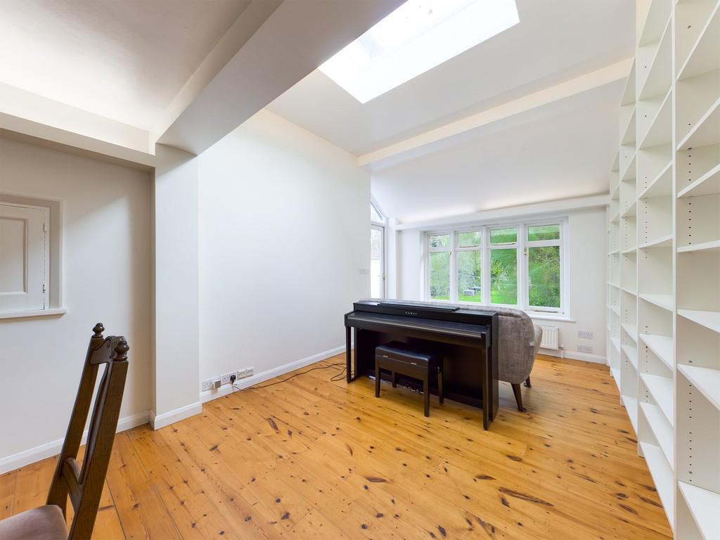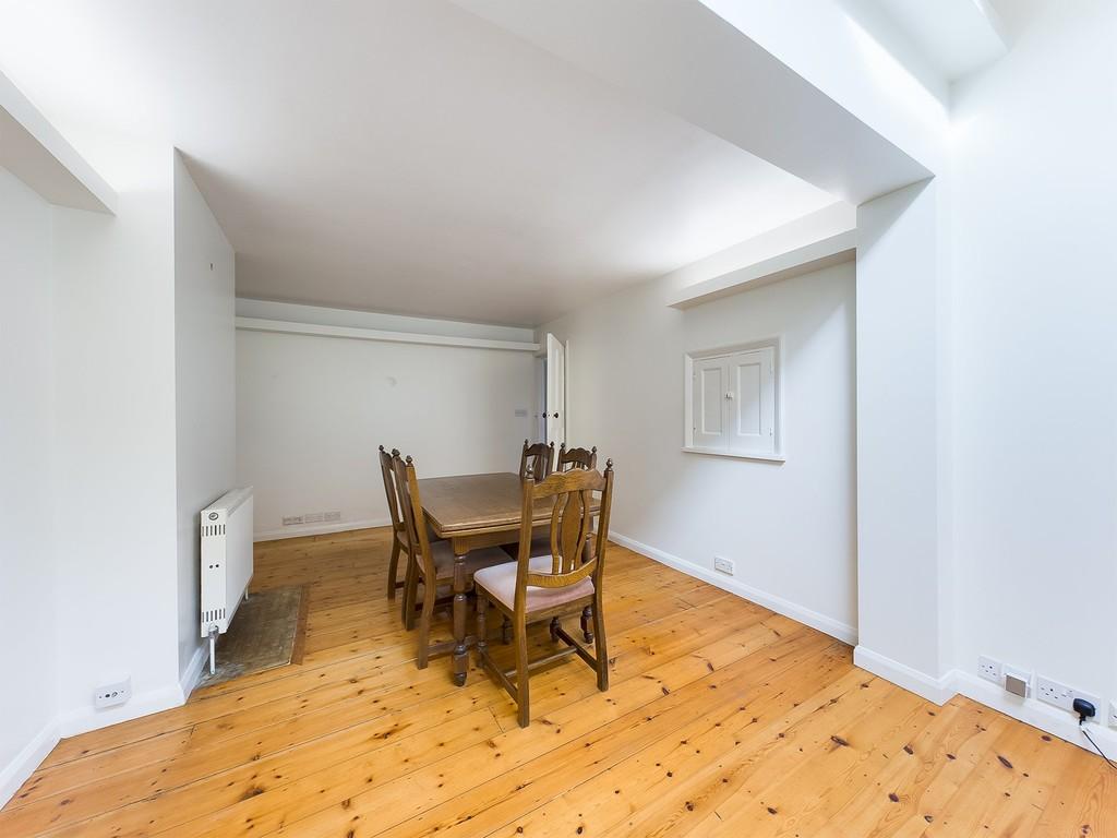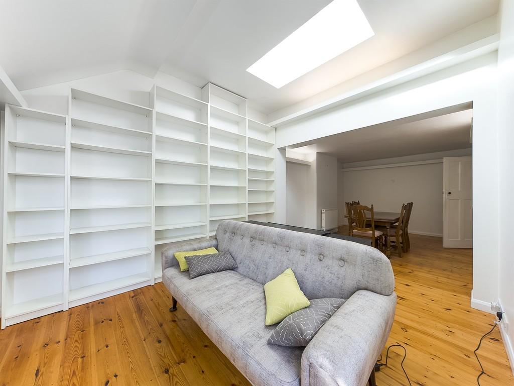 SITTING/DINING/FAMILY ROOM 26' 0" x 11' 0" (7.92m x 3.35m) spacious room with part vaulted ceiling, loft light, double glazed timber window and glazed door to rear garden, two radiators, uplighting at picture rail height, serving hatch to kitchen, built in shelving to one wall, pine floorboards.