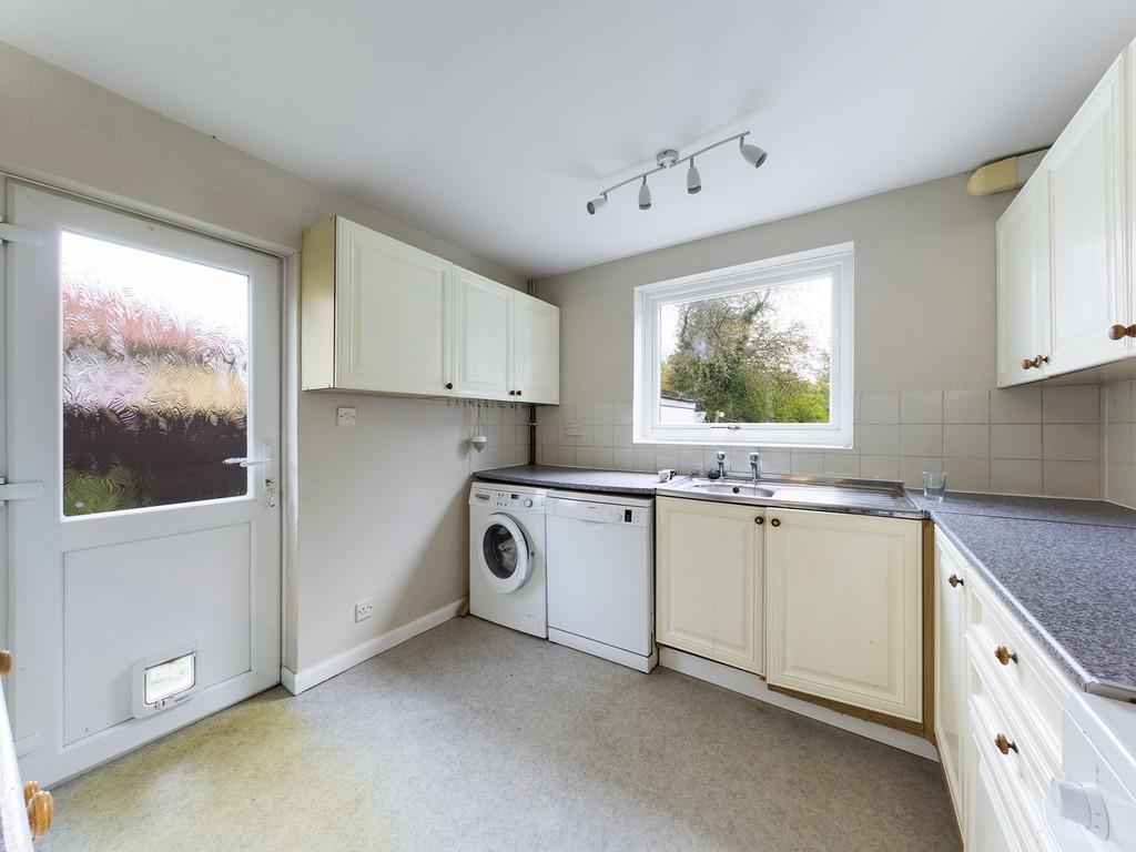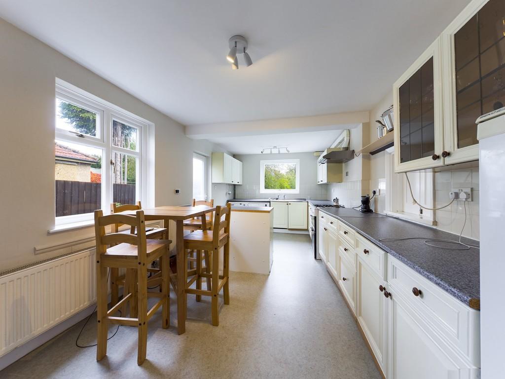 KITCHEN/BREAKFAST ROOM 18' 5" x 9' 11" (5.61m x 3.02m) with window to side, part glazed door to side, window to rear giving attractive views to garden, radiator, ceiling mounted spotlight units, range of fitted wall and base units with roll top work surfaces and tiled splashback, space for under counter fridge, space and plumbing for under counter washing machine and dishwasher, stainless steel sink unit and drainer, gas cooker point with extractor hood, space for fridge/freezer, radiator.