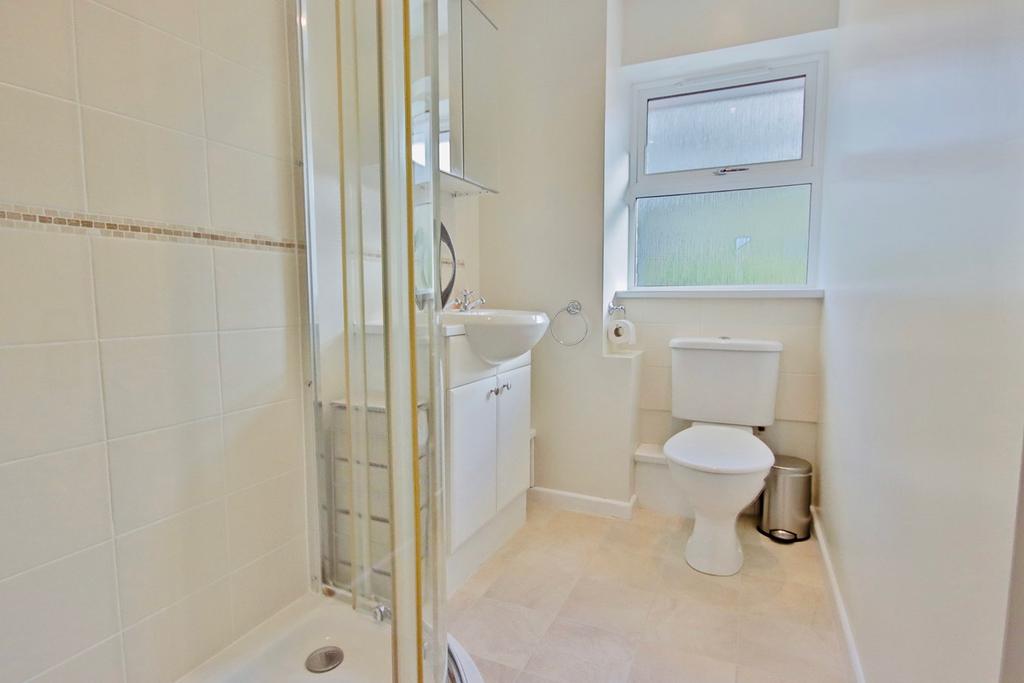 Corner shower with wall mounted power shower. Low flush toilet unit and sink with vanity storage cupboard. Triple glazed obscured glass window through to rear. Ceiling light point and towel radiator.