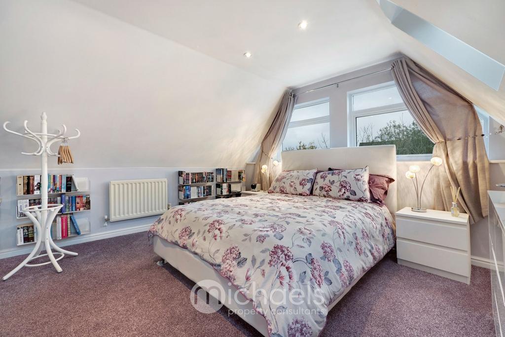 14' 3" x 12' 8" (4.34m x 3.86m) Double glazed window to side, Velux window to rear, radiator, eves storage, door to;