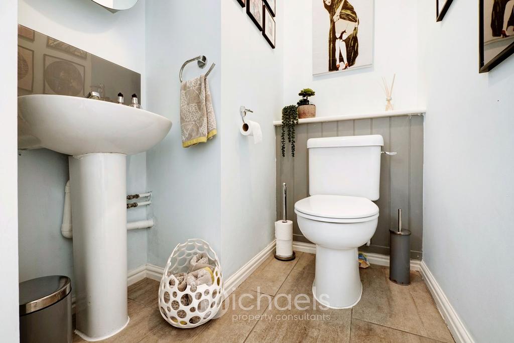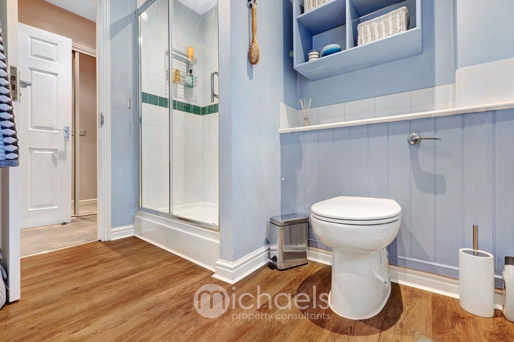 Opaque double glazed window to rear, radiator, WC, hand wash basin, extractor fan, panelled bath with shower over, tiled floor, door to airing cupboard