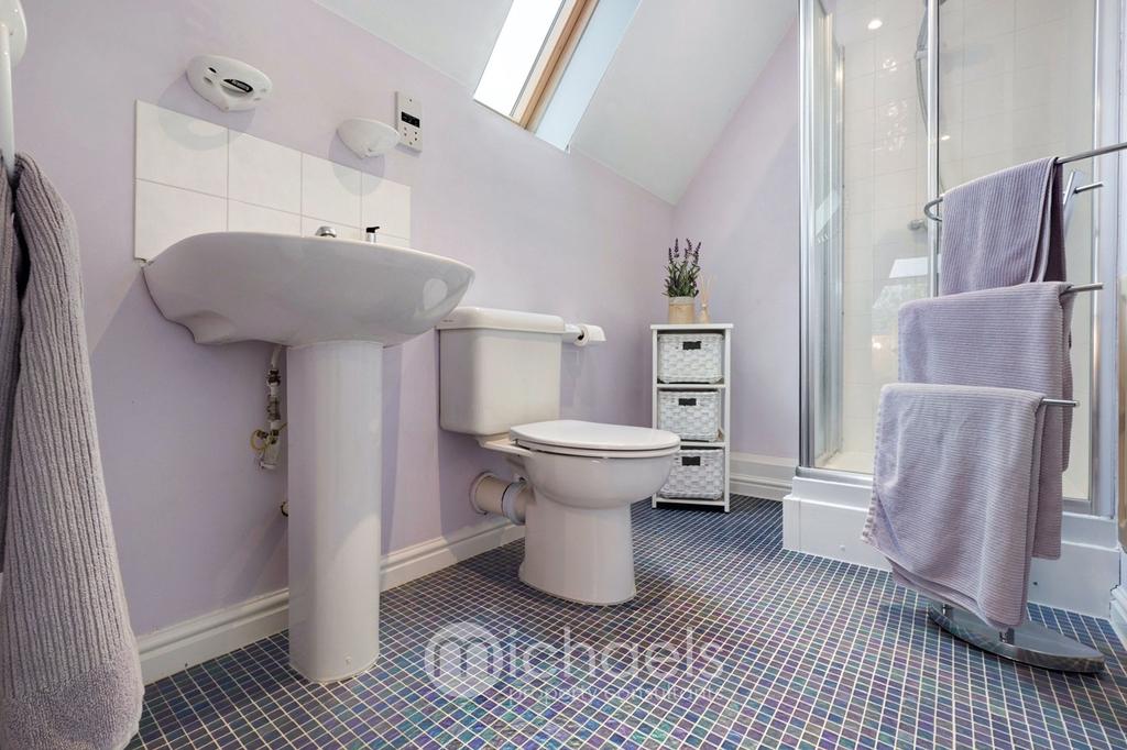 Velux window to rear, WC, hand wash basin, extractor, shower cubicle which is fully tiled.