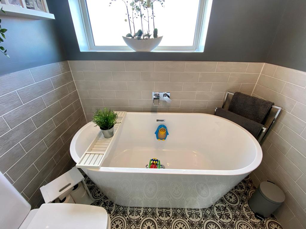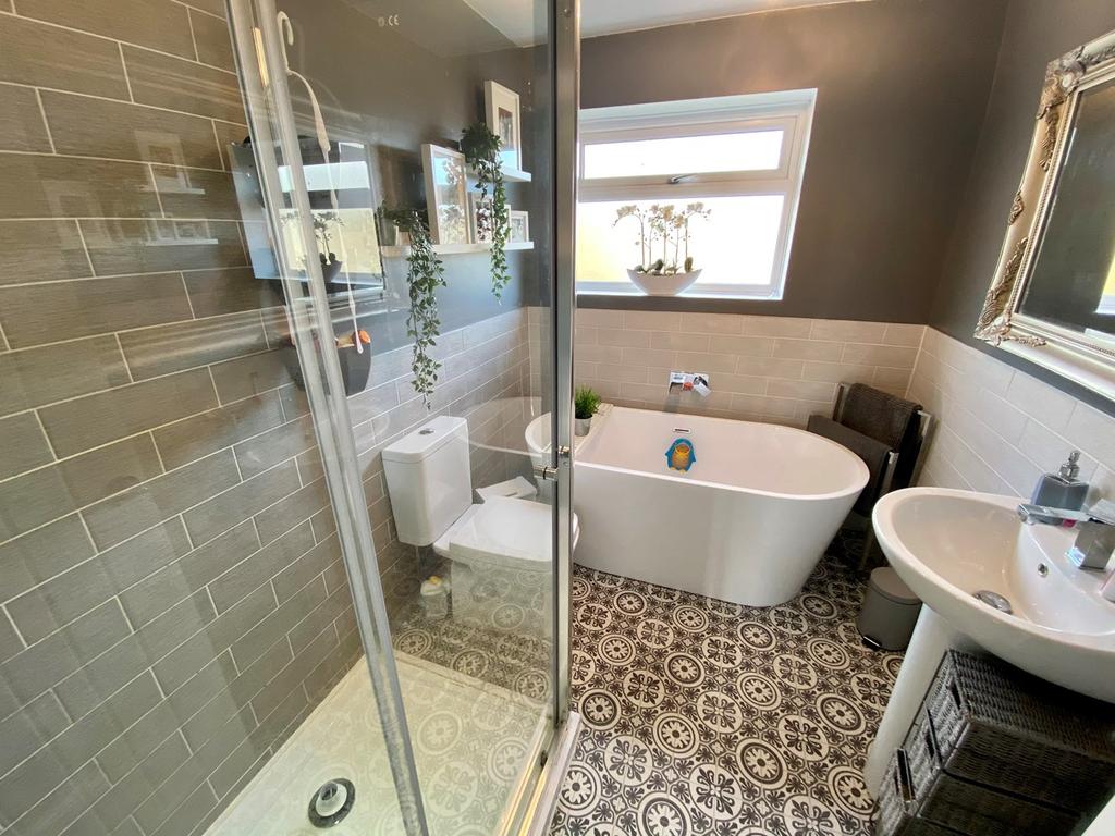 Being half tiled to the walls and having a white suite comprising a freestanding bath, large separate shower cubicle, pedestal wash hand basin and low level WC. Central heating radiator and upvc sealed unit double glazed window.