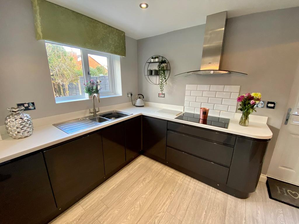 The spacious 'L' shaped family breakfast kitchen is a particularly attractive feature of the home, having glazed double doors leading to the sitting room and patio doors opening onto the rear garden, making this a perfect space for entertaining at home. There is a stylish and comprehensive range of fitted units comprising a one and a half bowl single drainer sink with mixer tap, fitted base unit, additional base cupboards with work surfaces over, breakfast bar and fitted wall cupboards. Built-in oven, hob and extractor hood. Integrated fridge and wine cooler. Two vertical central heating radiators, inset ceiling spot lights, laminate wooden flooring, half glazed side entrance door, two upvc sealed unit double glazed windows and sliding patio doors leading to the rear garden.