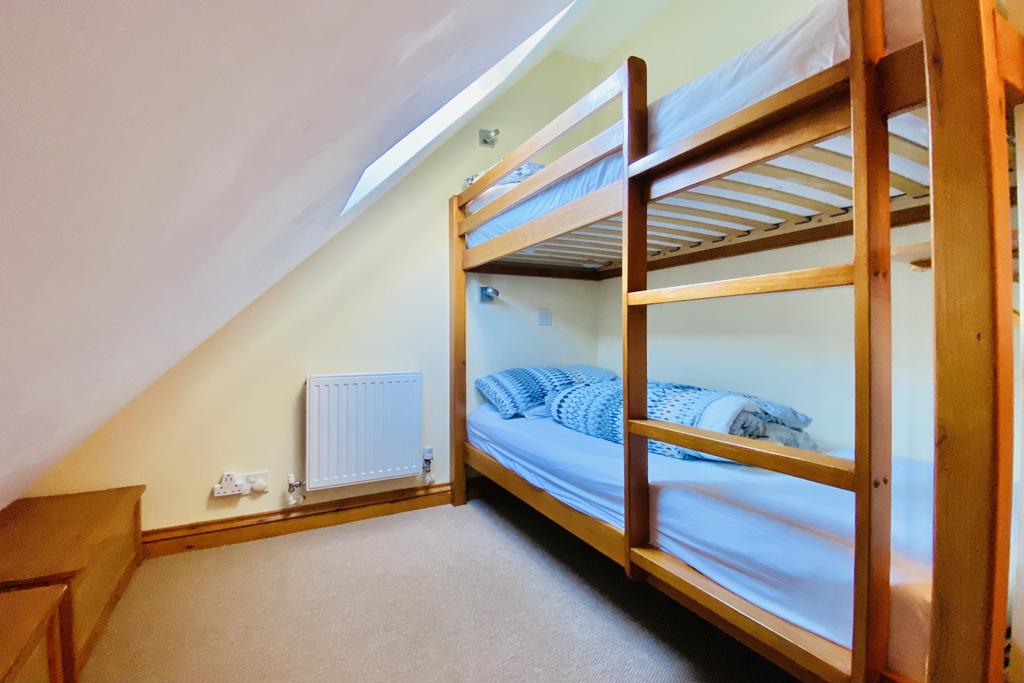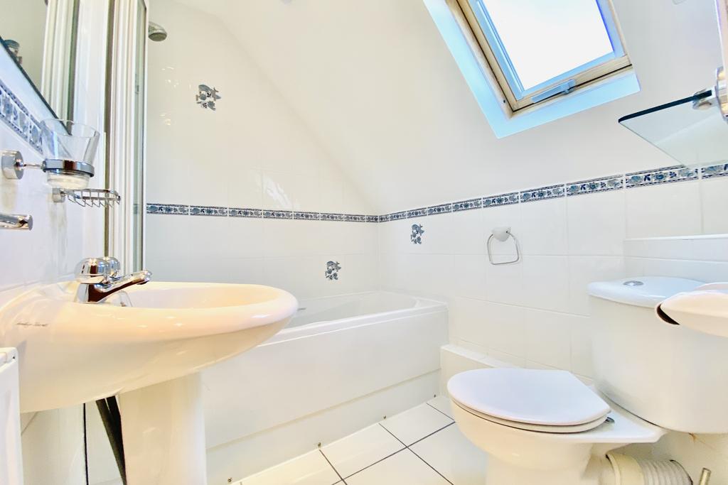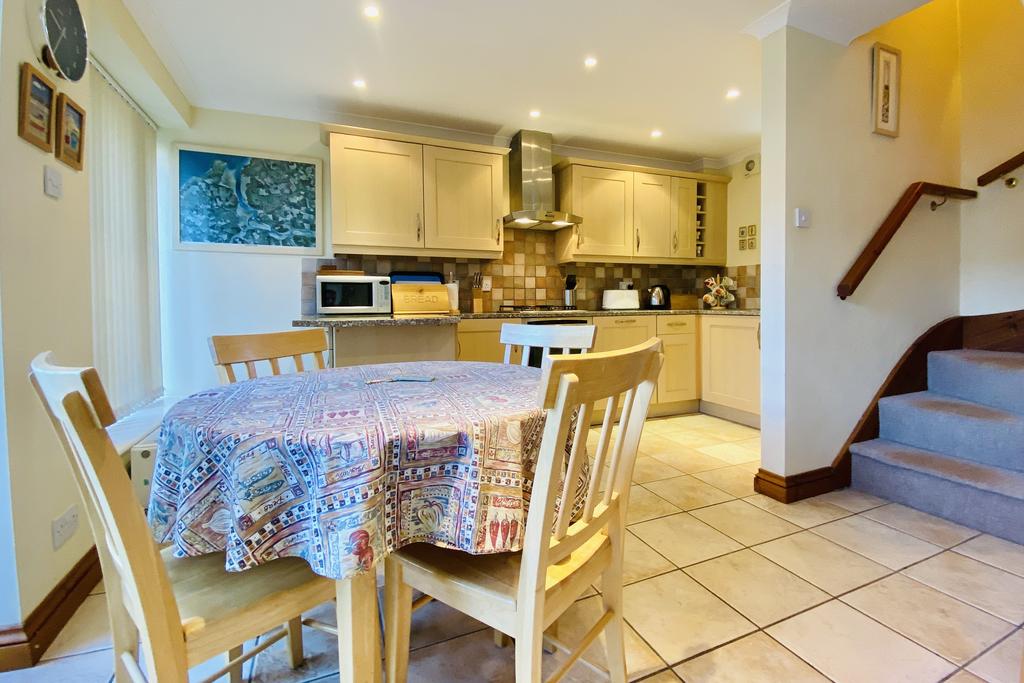 The ground floor is of open plan design with a tiled floor comprising a kitchen, dining and living area with French doors to the rear shared patio and a coal effect gas fire. There is ample space for sofas and occasional furniture. The kitchen has a range of floor and wall cabinets and drawers topped with granite worksurfaces and complete with an integral fridge, freezer, electric oven, gas hob, extractor, washer/dryer and dishwasher. Up on the first floor landing is a sloping ceiling and space enough for a bunk bed sleeping two. The double bedroom is a good size and the family bathroom is crisp, white and complete with a shower over bath.