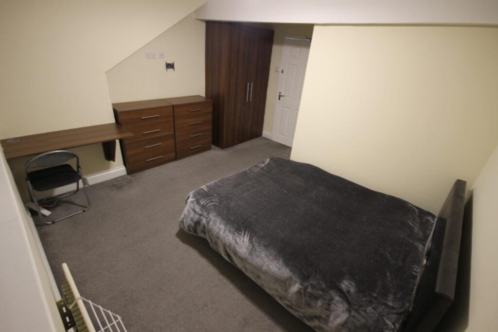 All bedrooms are well-furnished and neutrally decorated, featuring double beds, desks, wardrobes, and drawers. Each room is finished with white walls, grey carpet, and wall-mounted TVs, creating bright and comfortable study spaces.
