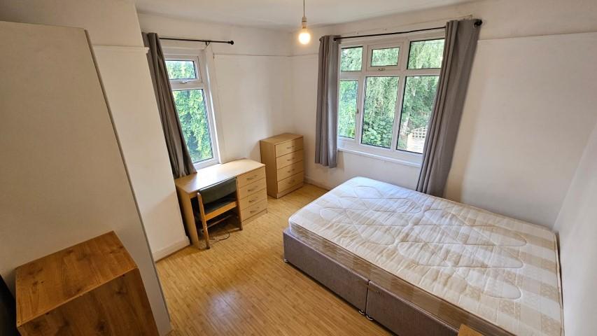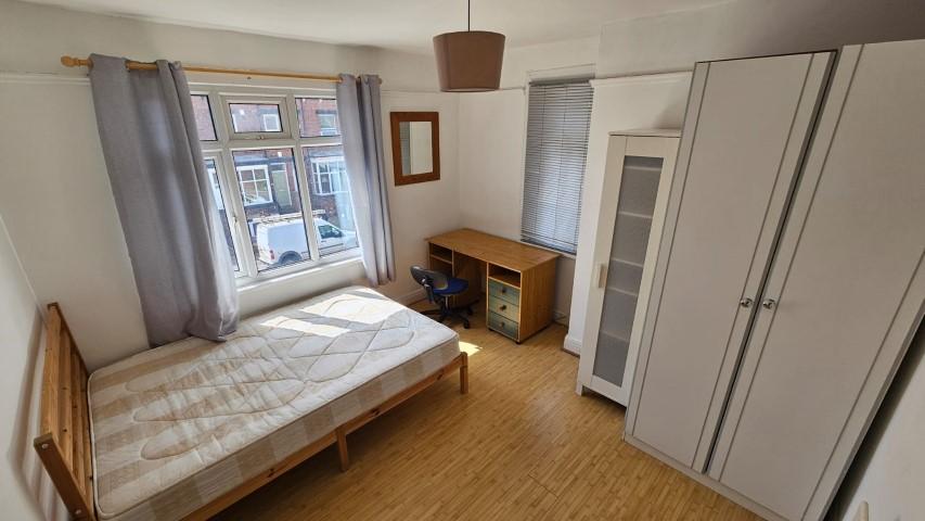 Three spacious double bedrooms, each naturally lit and fully furnished with a double bed, desk, and storage units. A single spare room is also included, ideal for guests or extra space.