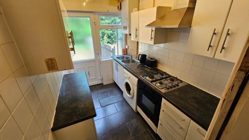 A stylish kitchen with integrated oven/hob, white units, white goods, and views into the garden. Plenty of cupboard space is available, with a back door leading to the garden.
