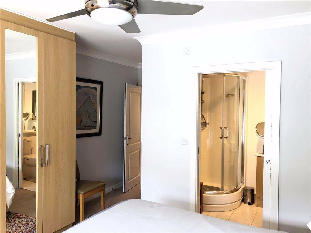 En-Suite Shower Room - 7'10" x 5'4" (2.39m x 1.63m) - Fitted with a white suite comprising low level W.C, washbasin inset in vanity unit with storage beneath and corner shower cubicle with double entry doors, glazed side panels and shower unit (not tested). Extractor. Part tiled walls. Tiled floor. Heated towel rail. Shaver socket.