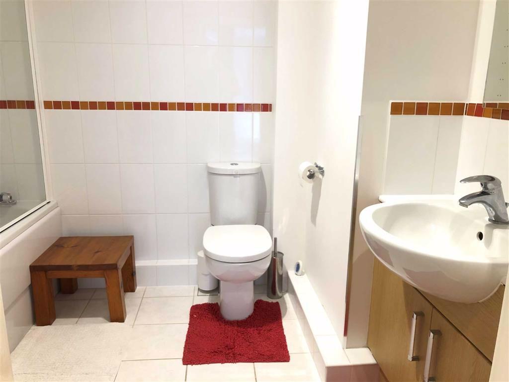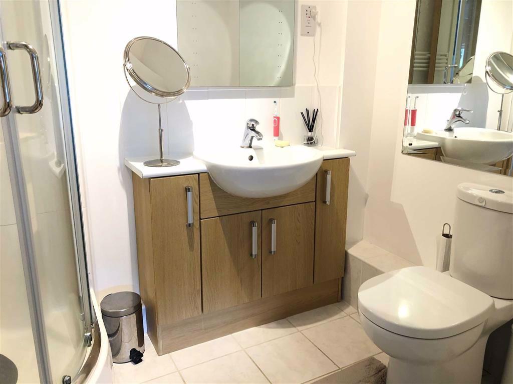 Bathroom - Fitted with a white suite comprising panelled bath with shower screen and mixer tap shower attachment, low level W.C and washbasin with chrome mixer tap inset in vanity unit with storage beneath. Heated towel rail. Part tiled walls. Extractor. Tiled floor. Shaver socket.
