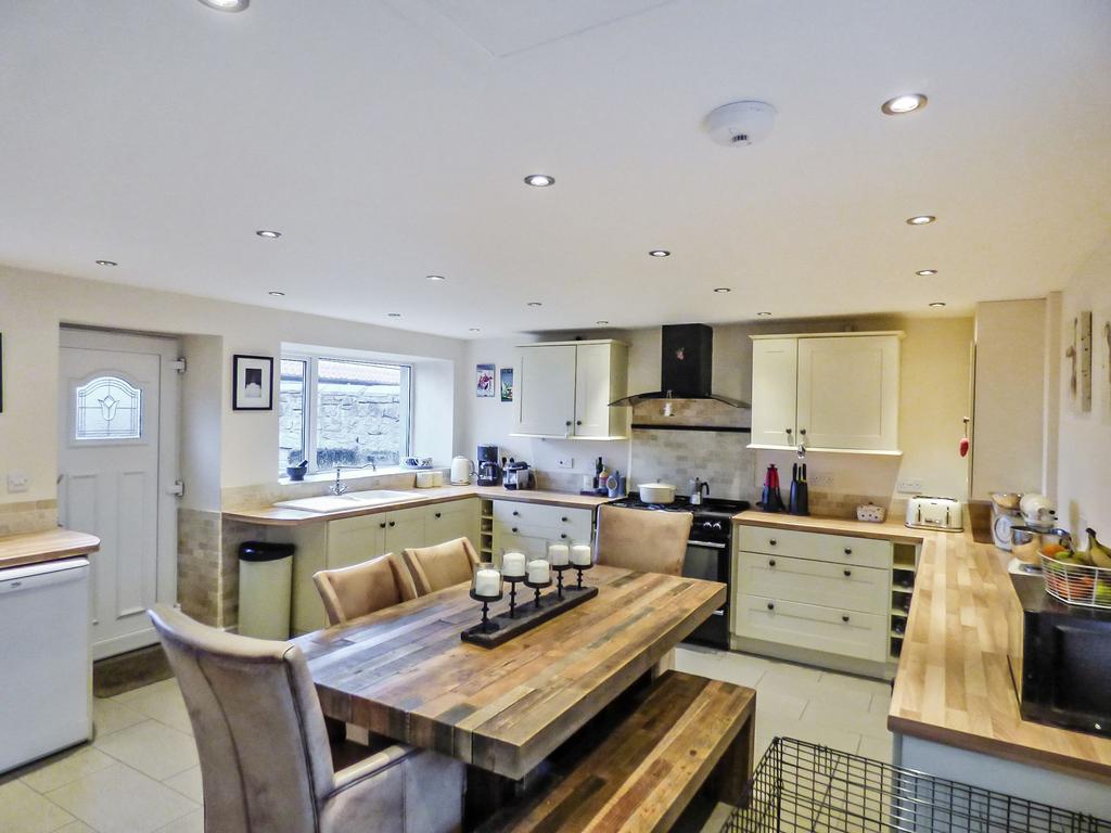 Dual-fuel range cooker with extractor over. Built in storage with oak doors. Energy efficient downlighters throughout room. Gas combi-boiler.