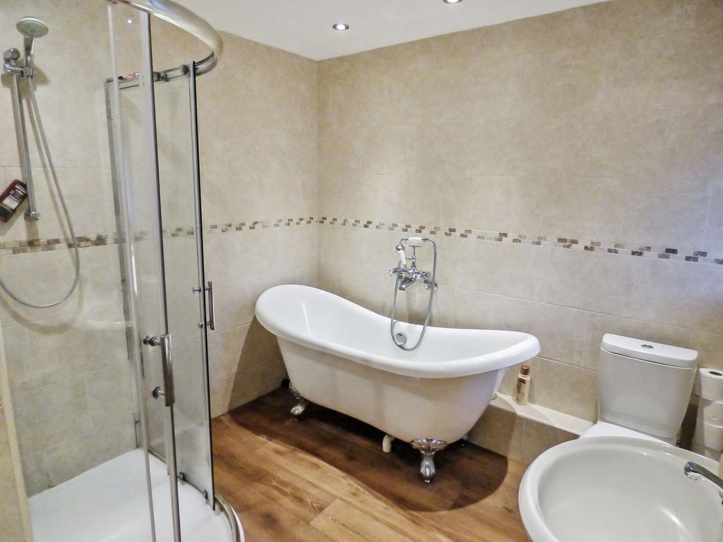 Spacious bathroom comprising white wash hand basin, free standing roll top double slipper bath with chrome feet, double shower cubicle with power shower and chrome fittings. Radiator and double glazed window. Travertine tiled walls.