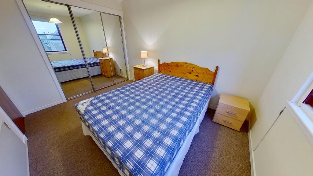 This bedroom is carpeted and contains a double bed with a full-size built-in wardrobe with mirrored sliding doors.