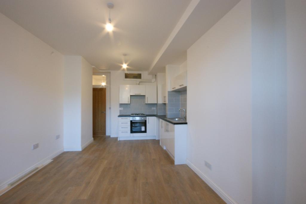 Own entrance with long hallway leading to main accommodation and door to rear garden. Open kitchen and living area with bay window to front of property, Kitchen is fitted with white gloss wall and base units, integrated single electric oven, gas hob and cooker hood. plumbing for washing machine