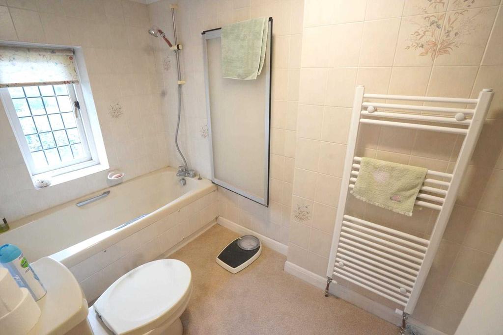 11'4 x 5'7 (3.45m x 1.70m). Panelled bath with mixer taps and shower attachment. Wash basin with cupboard under. Low level w.c. Shower cubicle with glazed doors and Bristan independent shower. Shaver point. ‘Ladder' towel rail. Tiled walls.