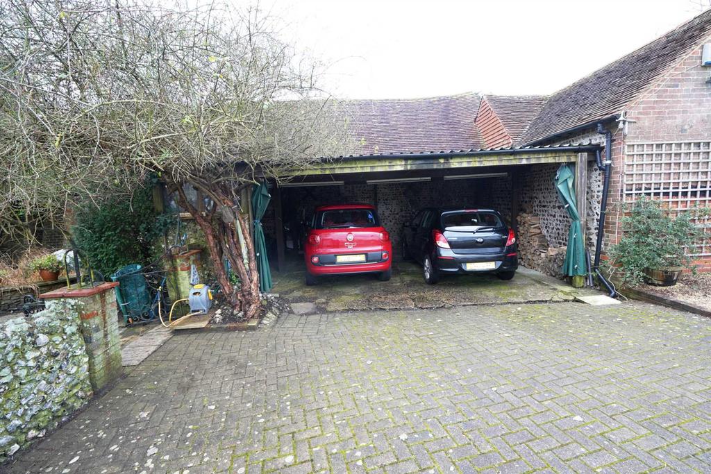 Patio and steps to a 3-level patio garden facing south and west with outside light. Crazy-paved area and large circular pond. Front flint barn/stables with flint boundary walls and wrought iron gates to driveway. Large brick pavier driveway with picket fence to 1.9 acres 3-section field looking to Mount Caburn, Beddingham Church and towards Lewes.