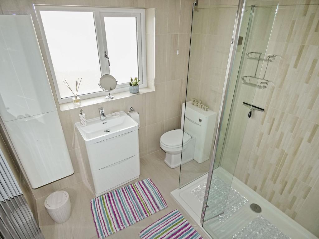 Frosted window to rear, newly fitted modern suite comprising double walk in shower cubicle with glass screen door and power shower, close coupled w.c, wash hand basin set in vanity unit, wall mounted vanity unit, vertical radiator, fully tiled.