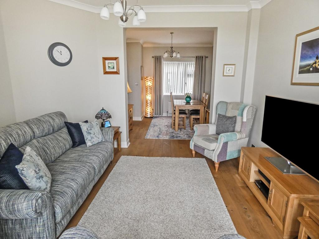Briefly comprising; entrance porch, hallway, lounge/diner, kitchen and cloakroom. To the first floor three bedrooms and family bathroom. Externally there is a walled yard to the rear with up and over door for access. To the front lawned garden with borders and patio area overlooking Newbiggin Bay.