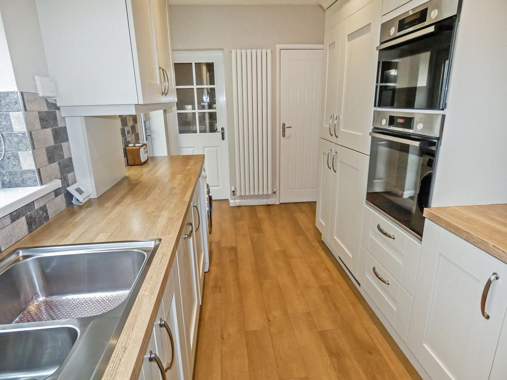 Window to side, access door into rear yard. Newly fitted modern kitchen comprising a wide range of wall, floor and drawer units with solid wood worktops and tiled splashbacks, high specification Bosch integrated appliances including gas hob with extractor over, combination double electric oven and microwave, fridge/freezer and dishwasher, one and a half sink and drainer with mixer tap, vertical radiator, laminate flooring.