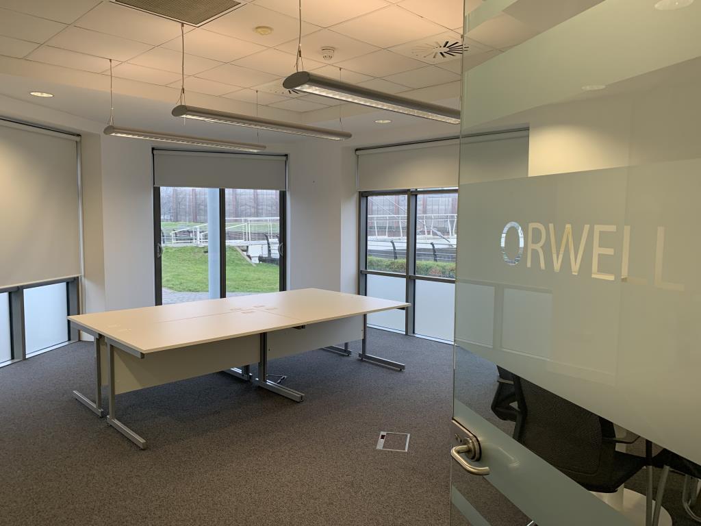 Main entrance into reception area. To the right there is the main open-plan office area with file storage system, a door opening to server room and meeting room/office as well as male, female and accessible cloakrooms with showers and cleaning cupboard. There is also a rear door to the parking spaces at the rear of the building. Directly behind the main reception area there is a kitchen and waiting area. To the left of the main entrance and reception there are three glass-fronted meeting rooms, one having sliding doors opening on to the river walkway. Furthermore, there is a second open-plan area, formerly the staff canteen/staff room and additional kitchen area.