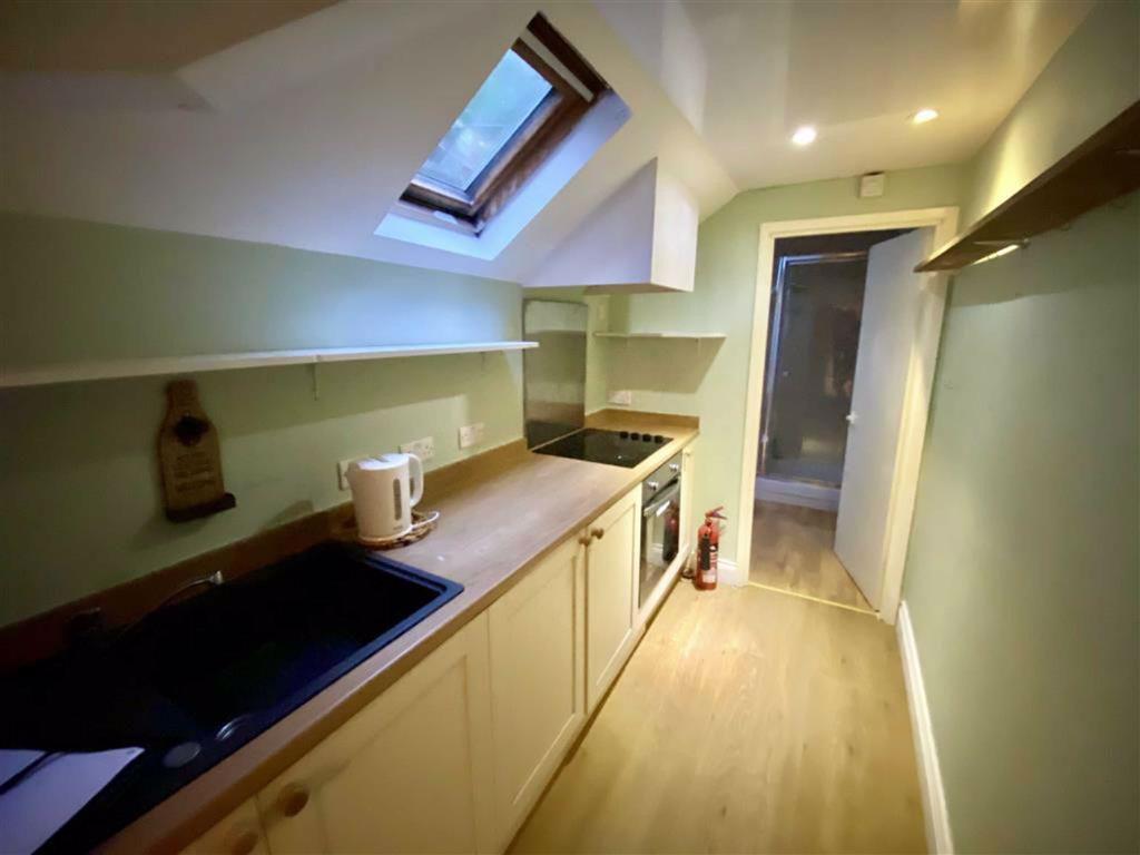 Kitchen: - 3.42 x 1.65 (11'3" x 5'5") - Fitted base units; single drainer sink; inset cooker; velux double glazed window. Door to:
