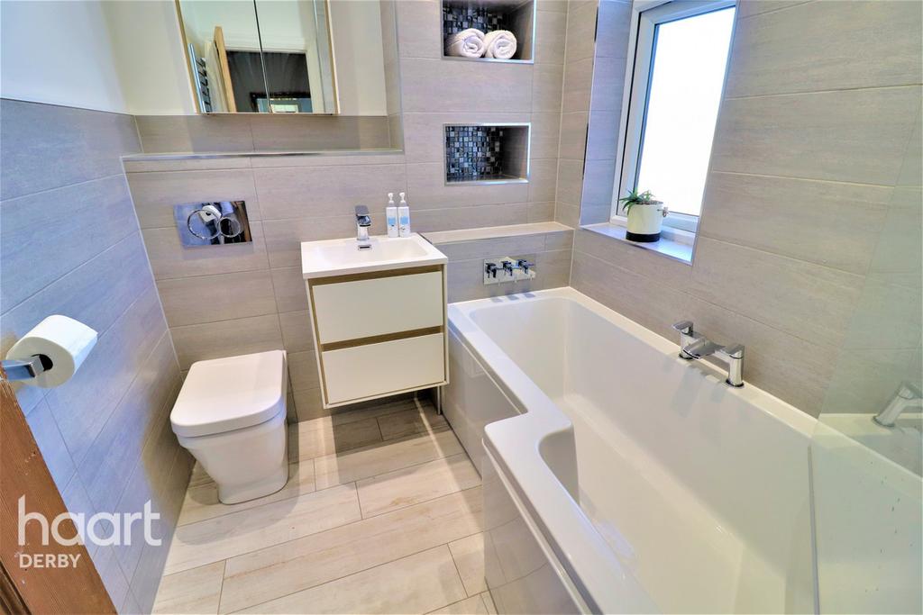 Comprising a l-shaped panelled bath with central mixer tap and built into the wall controls. Above the bath there is a dual shower head shower. Vanity wash hand basin and a concealed cistern WC. Tiling to the walls and floor mirror fronted heated towel rail and a double glazed window to the front elevation.
