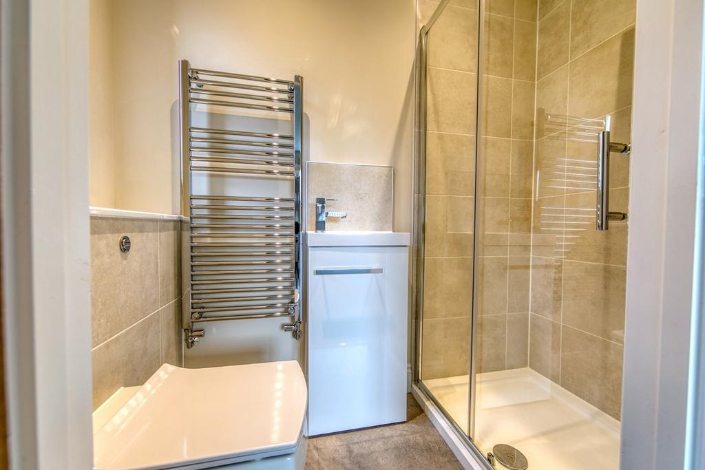 Obscure window to side, double shower cubicle, vanity wash hand basin with storage, heated towel rail, enclosed cistern WC, tiled splashbacks.