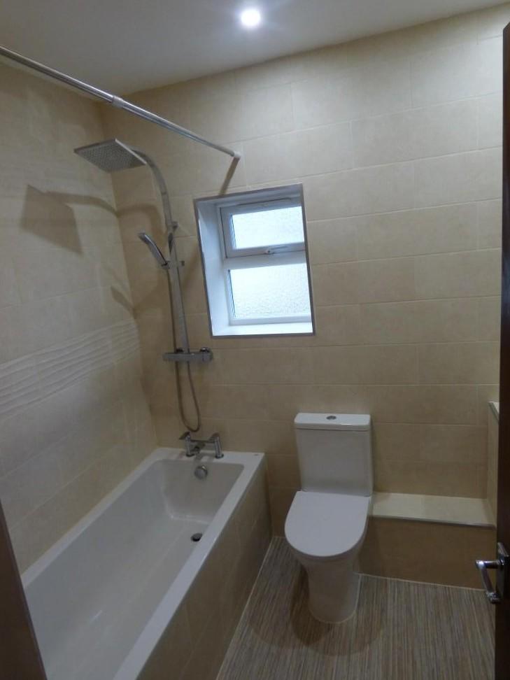 Fully tiled walls and a fitted suite comprising a panelled bath with shower attachment, wash hand basin with mixer tap, low level W.C. heated towel rail and a frosted double glazed window to the rear.