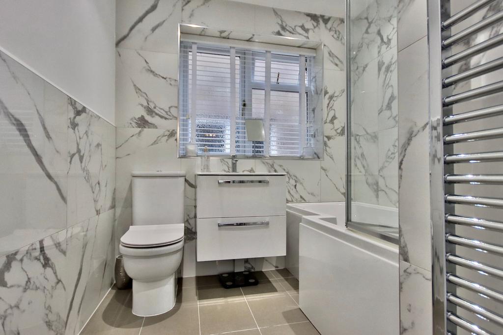 6' 7" x 7' 11" (2.01m x 2.41m) Bath with wall mounted rainfall showerhead. Low flush unit toilet and sink with underneath vanity storage cupboard. Obscured double glazed window through to side aspect. Tiled walls and flooring. Recessed ceiling light points and towel radiator.