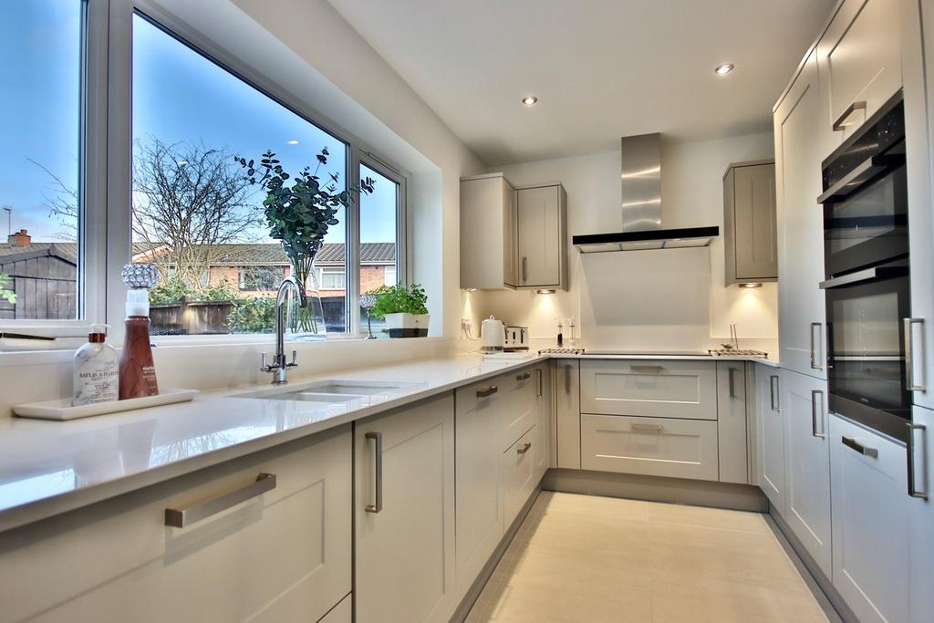 27' 0" x 9' 10" (8.23m x 3.00m) Modern style fitted kitchen with matching base and wall storage cupboards featuring a range of Integrated appliances including; sink with chrome mixer tap and drainer, electric hob and extractor fan, modern oven, fridge/freezer and dishwasher. Double glazed window with view of rear aspect. Sliding patio doors with access to rear garden. Ceiling light points and tall radiator units.