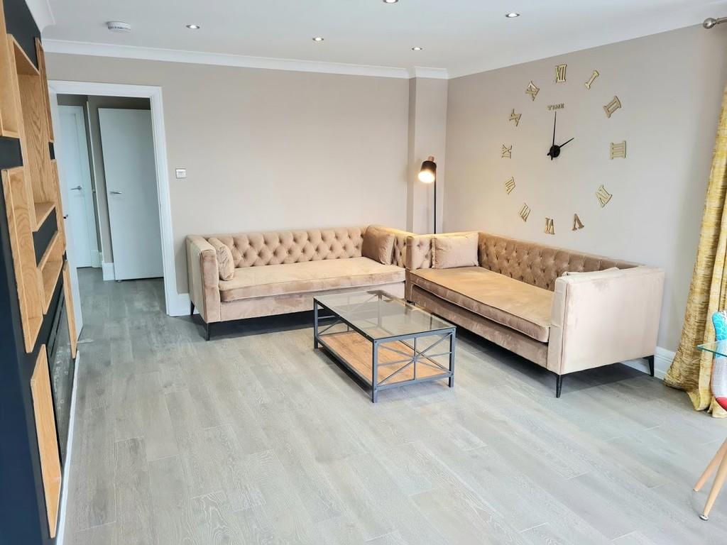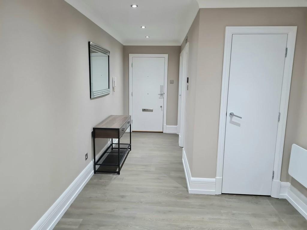 Reception/Lounge: Spacious and light this contemporary and stylish dual aspect reception has a built in be-spoke media unit with shelving and feature electric log fire, large clock wall feature, LED lighting and patio doors leading to a wrap-around balcony with river views. Furnished with two sofas, dining table and chairs, glass chrome framed coffee table, luxurious drapes, lamp and radiator covers.