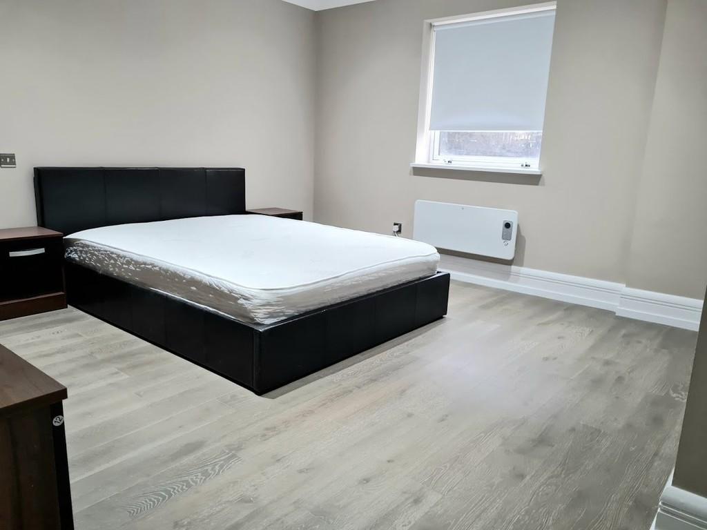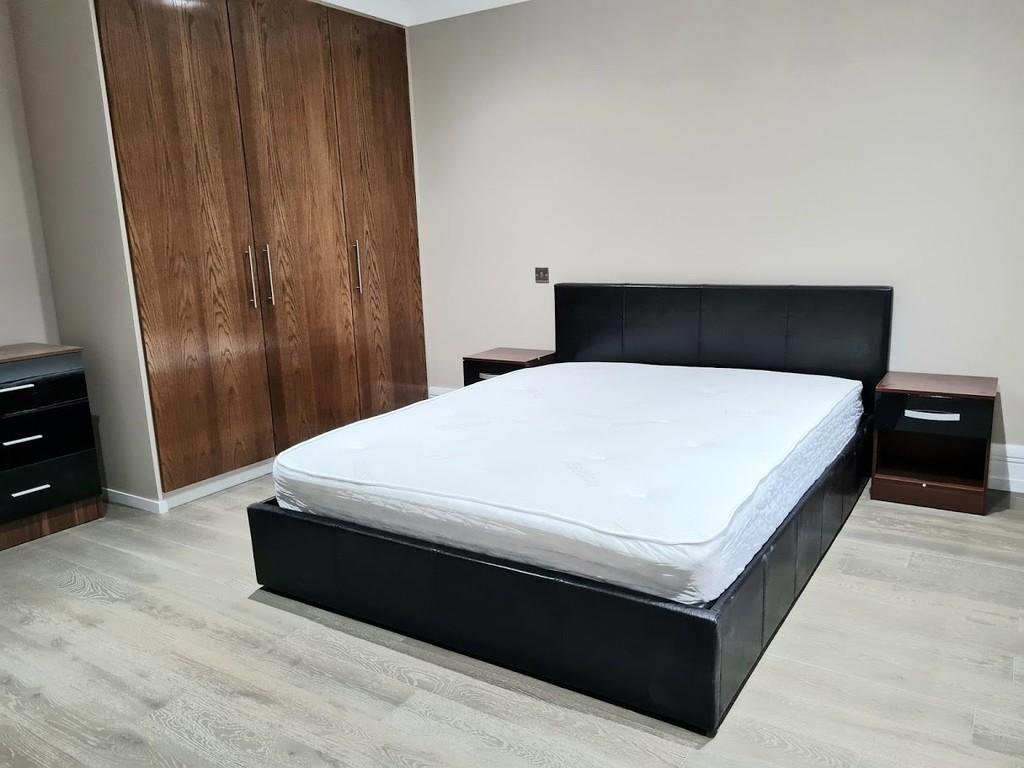 Master bedroom: Generously proportioned with dual aspect views and built in oak veneered wardrobe, king size leather bed with headboard and storage, oak chest of drawers and bedside cabinets, spotlights and black-out blinds.