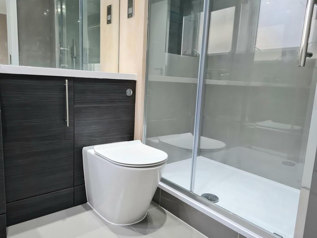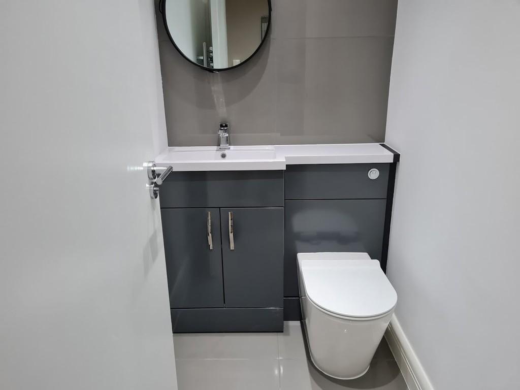 Guest En-suite shower room: Extra large glass shower cubicle with shower and mixer, low level concealed cistern W.C with chrome button push plate and vanity unit with ingress wash basin and mixer taps. Vanity mirror and same finishes apply.