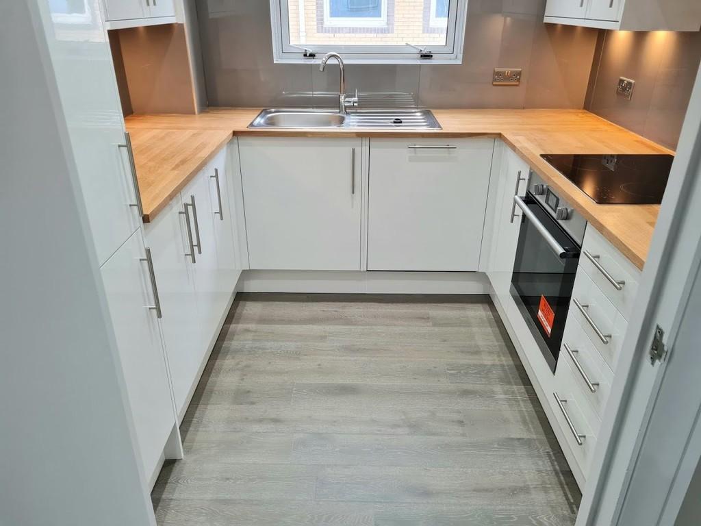 Kitchen: Fully fitted modern white high gloss units with chrome handles, integrated appliances including oven, hob ang grill, extractor hood, dishwasher and fridge/freezer. Brushed chrome sockets, under unit LED lighting, spotlights and solid oak worktops provide the finishing touches.