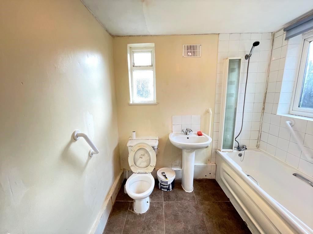 Double glazed window to side, bath with shower over, wash hand basin, low level WC and tiling to walls.